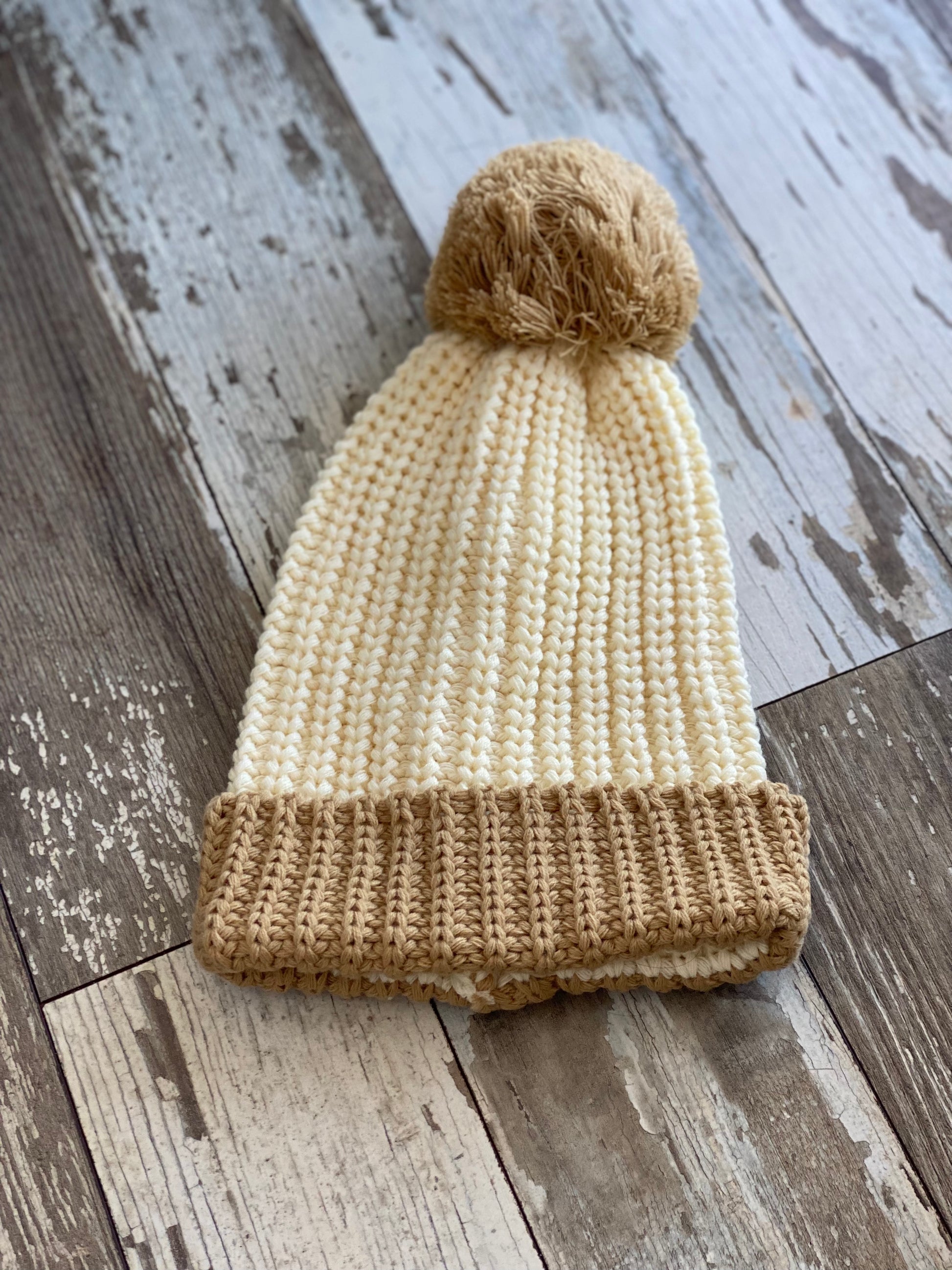 Chunky Cable w/ Cuff & Pom Beanie - Cream/Mocha