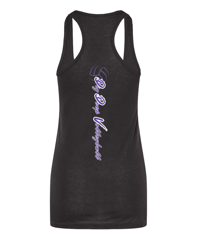 Custom volleyball club racerback tank with a bold vertical back logo. Lightweight, breathable, and perfect for players, coaches, or team fans.