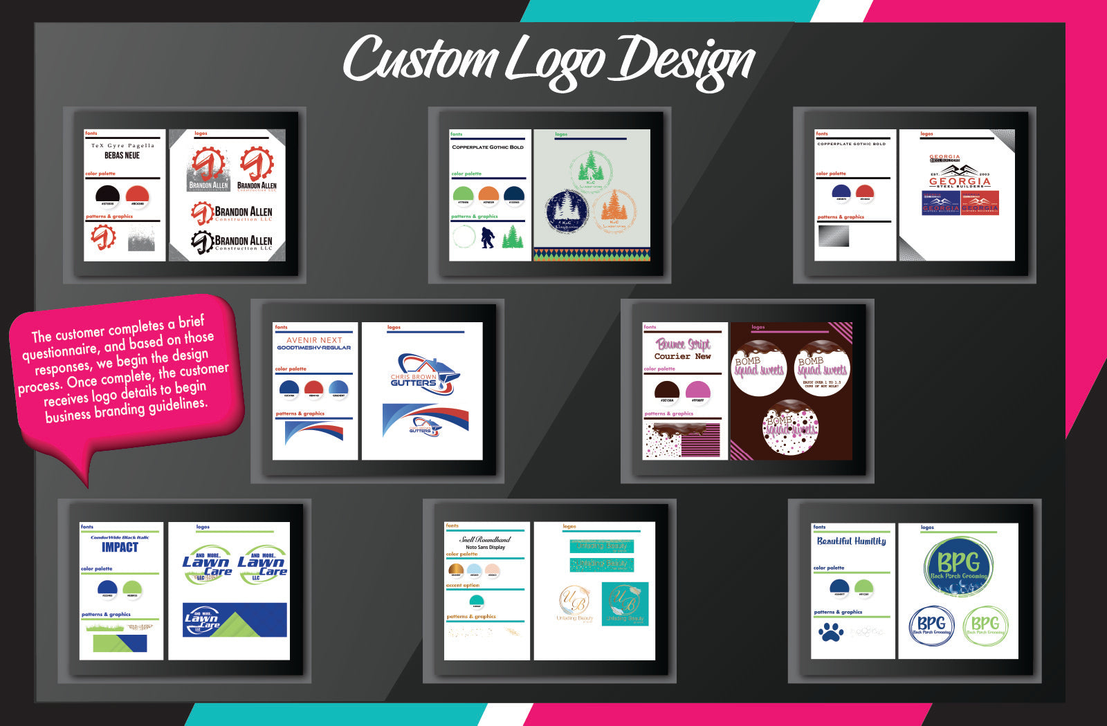 Shop NowProfessional custom logo design tailored to elevate your brand. Whether you're launching a new business or rebranding, we create unique, high-quality logos that capture your business vision. Perfect for small businesses, startups, and entrepreneurs looking to stand out. Once completed, you will have a complete branding board to create professional marketing materials.